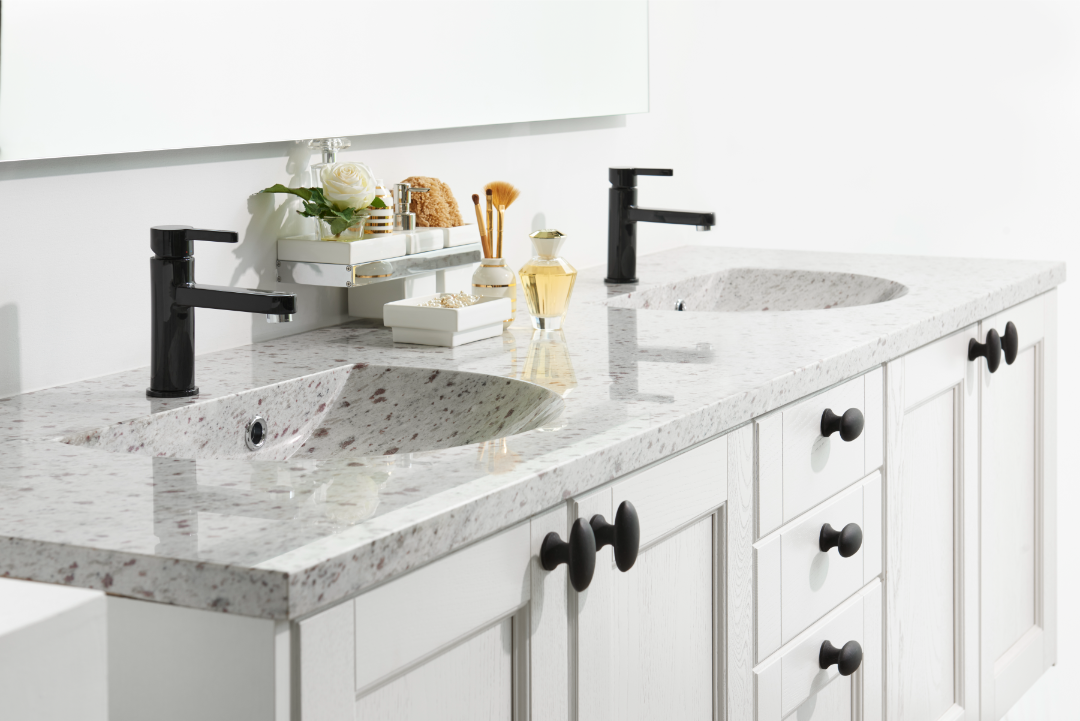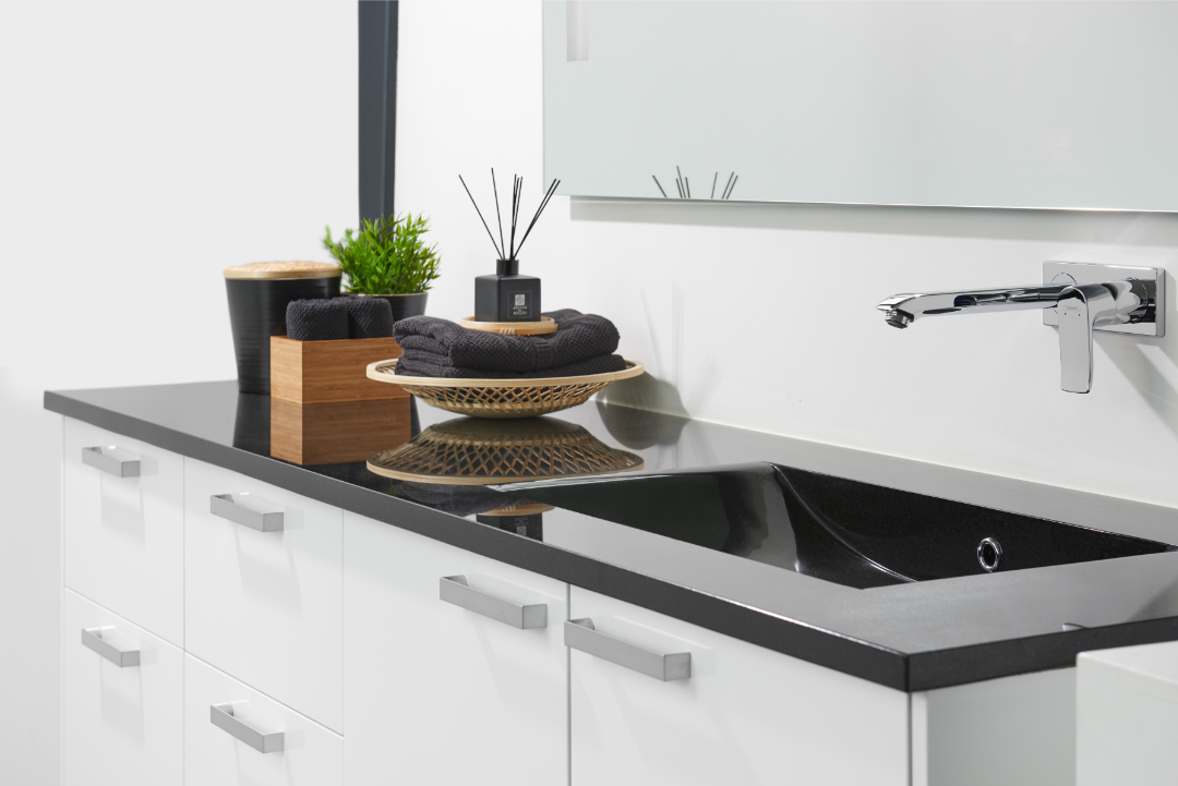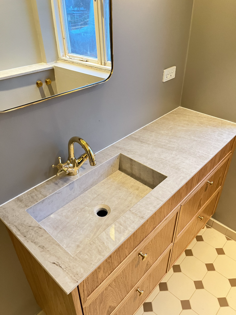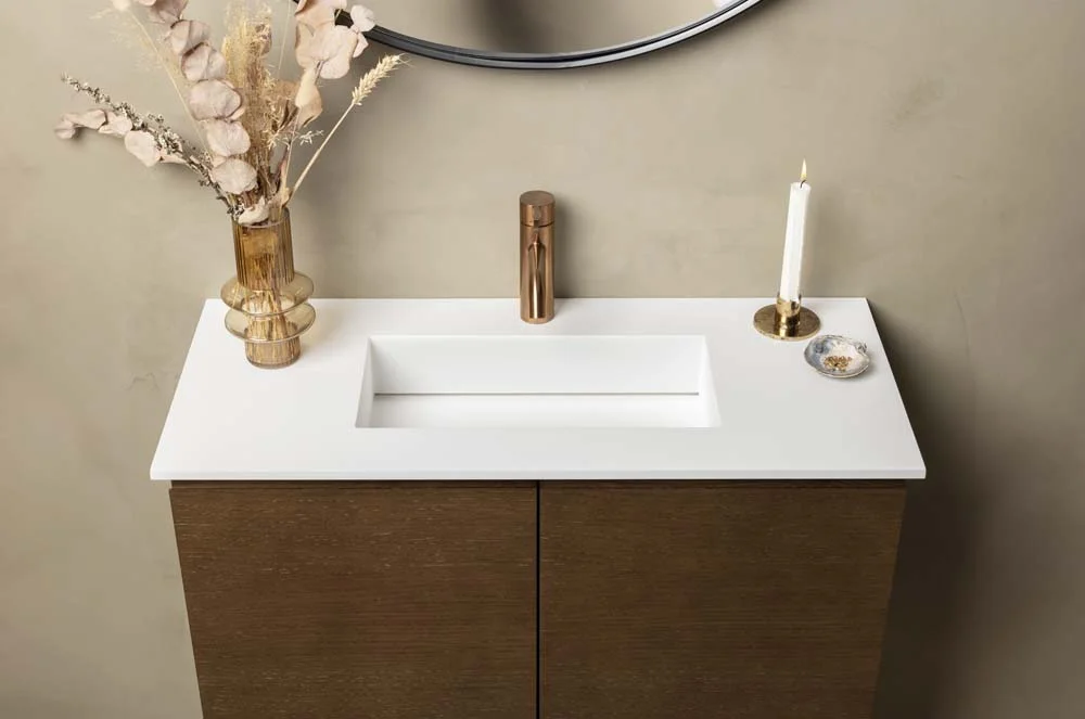 Vaske med bordplade har i årevis været den mest solgte håndvask til badeværelser, da de passer til enhver stil. I Danmark er størstedelen af solgte håndvaske placeret over et badeværelsesskab, hvilket giver både æstetik og funktionalitet. Hos Granitworld tilbyder vi fremstilling af vaske med bordplade i alle stenmaterialer fra vores omfattende sortiment. Vi samarbejder også med anerkendte mærker som Marmorline, Cassøe og Cosentino for at levere kompromisløst, dansk design i hver støbt bordplade med vask. Vi skræddersyr løsninger til dit badeværelse baseret på dine ønsker til mål, materiale, farve, type af vaskekumme og tilbehør.