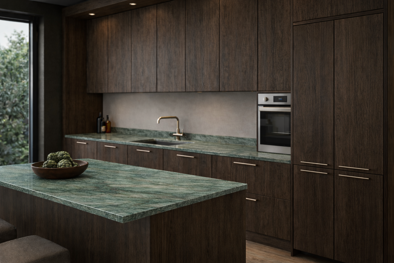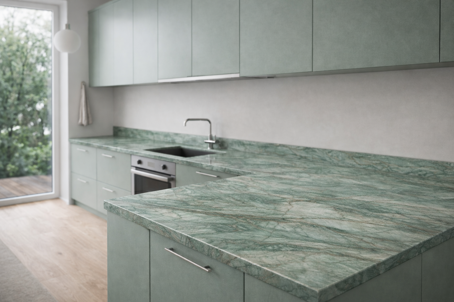 Emerald Green / Adventure Quartzite bordplade er en unik natursten har varieret mønstre, som gør hver plade unik. Denne bordplade er et ægte mesterværk af naturen, skabt gennem millioner af år, og bringer en helt unik æstetik ind i dit hjem.