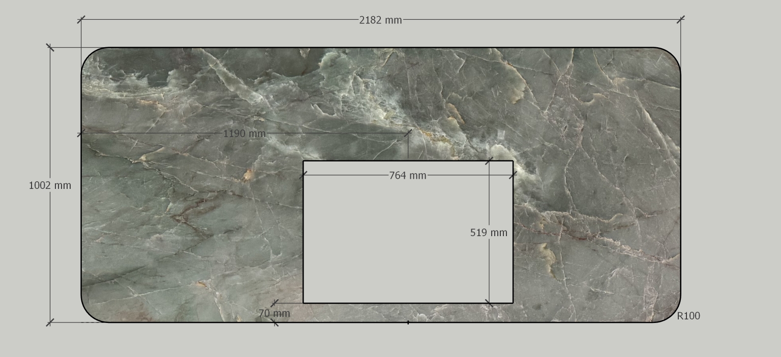 Materiale: Quartzite Jadore – 20 mm, poleret overflade og afrundende hjørner